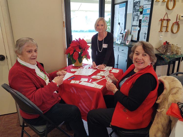 We had so much fun at our Annual Holiday Party, Magic Moments, in December 2024 at Brookview. Our dinner, CATERING BY CYNTHIA of scallops in Champagne Sauce and Stuffed Mushrooms as appetizers, Caesar Salad, Chicken Piccata, Cheesy Scalloped Potatoes, Sautéed Green Beans, and Tiramisu, Berry Custard Cakes, and Lemon Bars for dessert was delicious. Sandy Wolfe conducted her famous Box Game! A great time had by all!